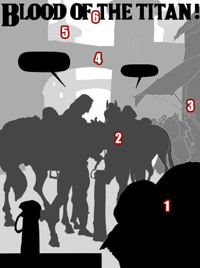 Here's a shot of the page separated into 6 planes that I felt needed to be separated. The darker the silhouette, the closer it was to the viewer.