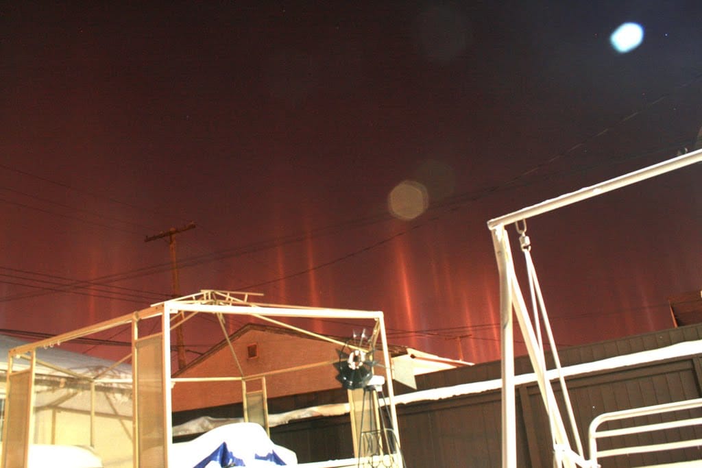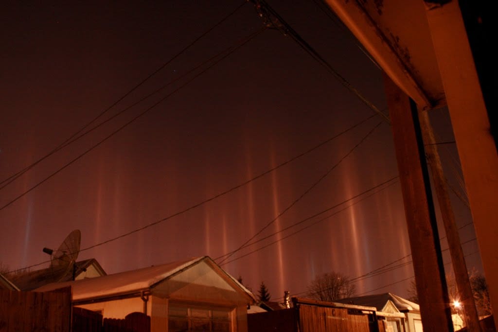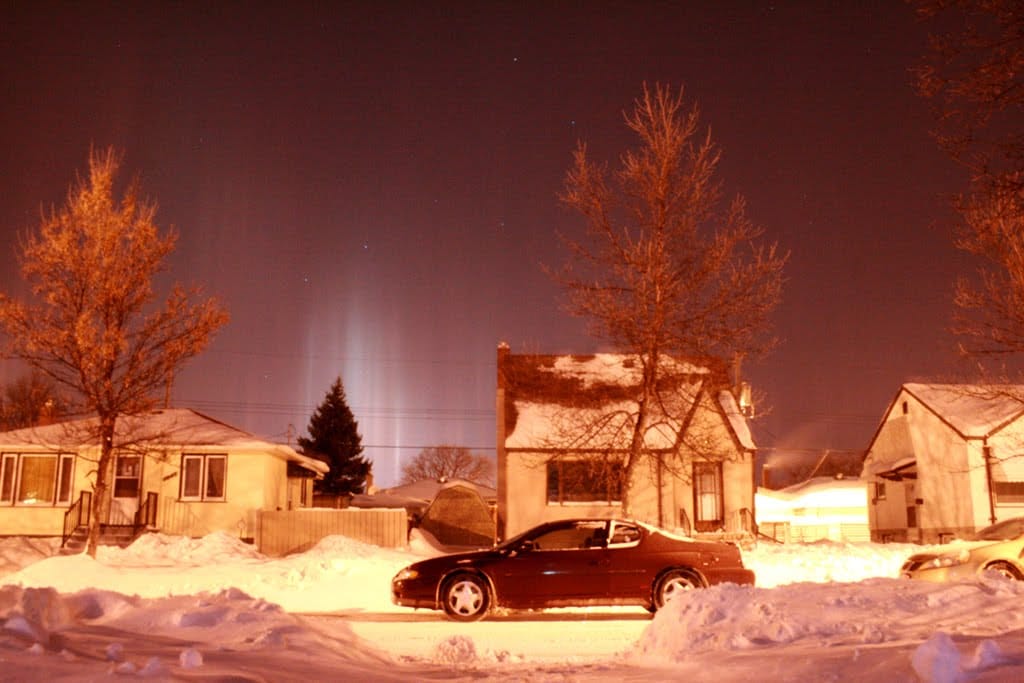My cousin Scott has me thinking that these may have just been ice crystals reflecting the city lights, which makes sense as they shimmered vertically. Not the horizontal 'dancing' you might expect from Aurora Borealis... I sent an email in to CTV weather personalities Sylvia Kuzyk and Jordan Witzel. If anyone can get to the bottom of this, they can!